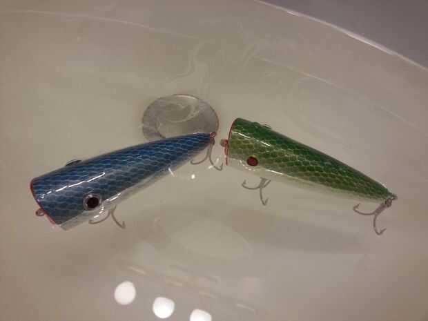 Con el acabado completamente curado, se puede probar el señuelo. Fije los ganchos a los anillos de división y los anillos de división a los ojos del tornillo de señuelos. El señuelo está ahora completado. Llene un fregadero y prueba los señuelos para ver cómo flotan. Ahora ir a coger algún pez.
