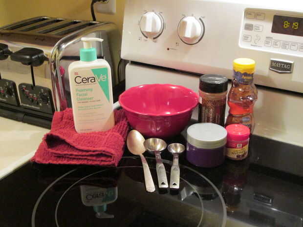 1 toalla pequeña, cinta para la cabeza (se necesita esto si tu cabello es largo), se enfrentan a lavado o jabón (dependiendo de tu tipo de piel), 1 tazón de fuente (para guardar todo), un lugar vacío en la nevera y una cuchara.