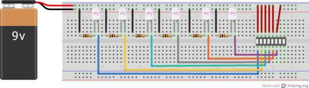 Poner los LEDs en la protoboard. Añadir resistencia de 100 Ohm y ponerlo en línea con el cátodo (-) a la parte superior de la placa. Será conectar a tierra.