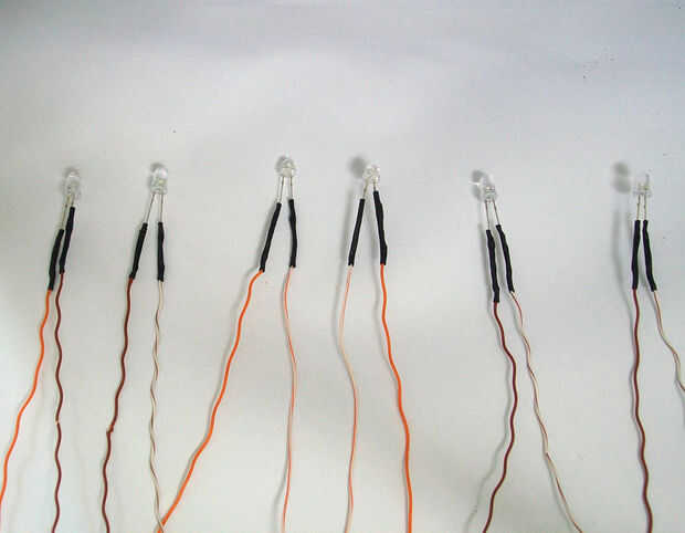 Soldadura ánodo y el cátodo del LED con el cable de puente y la tubería del encogimiento es esencial para evitar un cortocircuito. Hacer 6 de estos. (ver imagen 3)