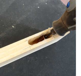 4. puesto que la anchura del agujero aburrido es sólo 10 mm, utilizando un cincel de madera no es práctico. Una multiherramienta Dremel con anillo pequeño lijado funciona como un sueño para limpiar hacia fuera de la mortaja. La razón por la que modifica la profundidad de 50mm a 30mm es para que pueda llegar a la parte inferior de la morise con un anillo de lijar Dremel.