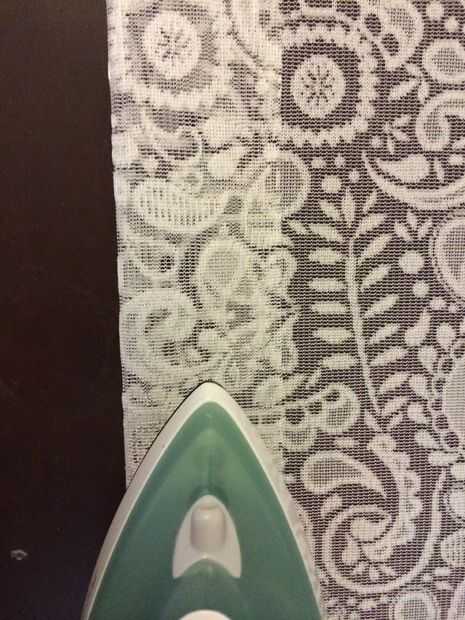 Doblar los bordes uniformemente a través de todo el camino. Usé las tijeras como una guía para que la siguiente cortina sería exactamente el mismo. Plancha hacia abajo.