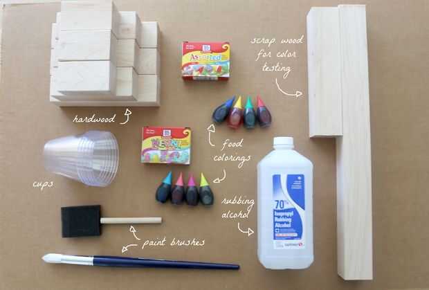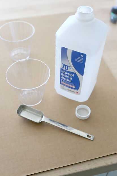 Dependiendo qué tan grande una superficie tiene que manchar, para cada 1 cucharada de alcohol, desea usar 10 gotas de comida para colorear. Para mis pequeños bloques, sólo necesitaba 1 cucharada de alcohol.