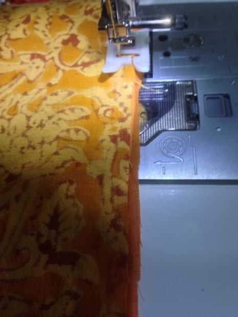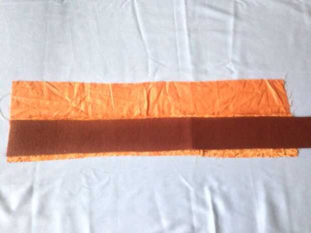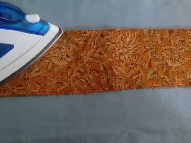Unir los dos llano y banda de tela impresa a lo largo. Hacia el lado correcto y plancha la costura y coser una puntada. Abrir y colocar la guarnición (1/4" densamente fieltro)