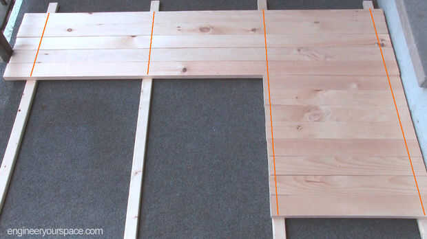 Espaciar los listones de enrasar uniformemente a lo ancho del panel, alinee las tablas de pino de 1 "x 3" sobre los listones y marque la ubicación de los tornillos para que alinee con el centro de los listones.