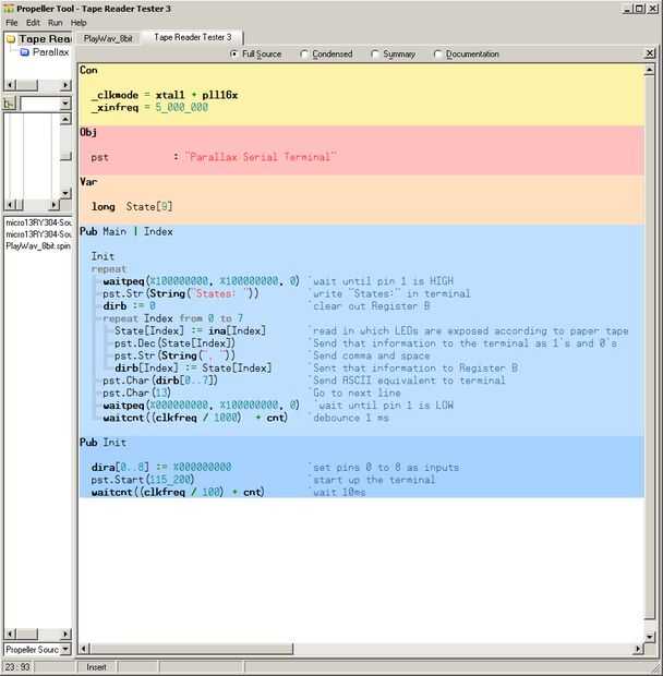 Ahora que tienes el hardware configurado, el programa eeprom de la hélice con el siguiente código. Lo que esto hace es mostrarte qué letras representan su cinta de papel tarjeta de sacador - para que sepas lo que es el mensaje! Voy a mostrar lo que se verá en el final!