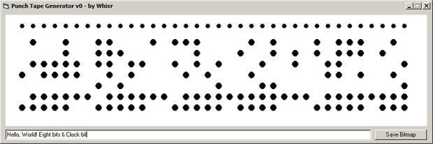 Nos lanzó un rápido programa juntos (en vez de poner el mensaje hacia fuera a mano en un editor de gráficos) que le permitirá escribir cualquier mensaje que queríamos. Este lector de cinta de papel utiliza la representación de bits ASCII, así que puede apoyar impares símbolos así como su típica A, B, C.