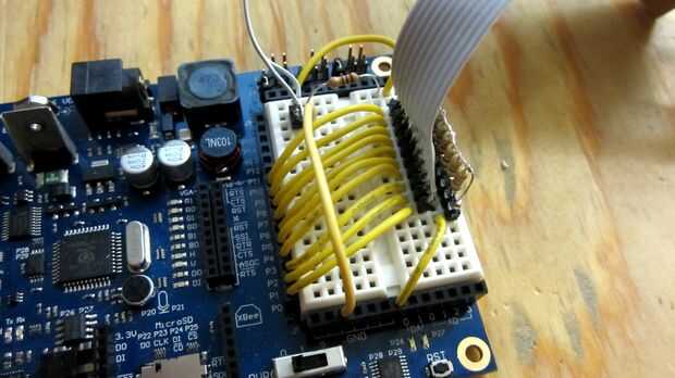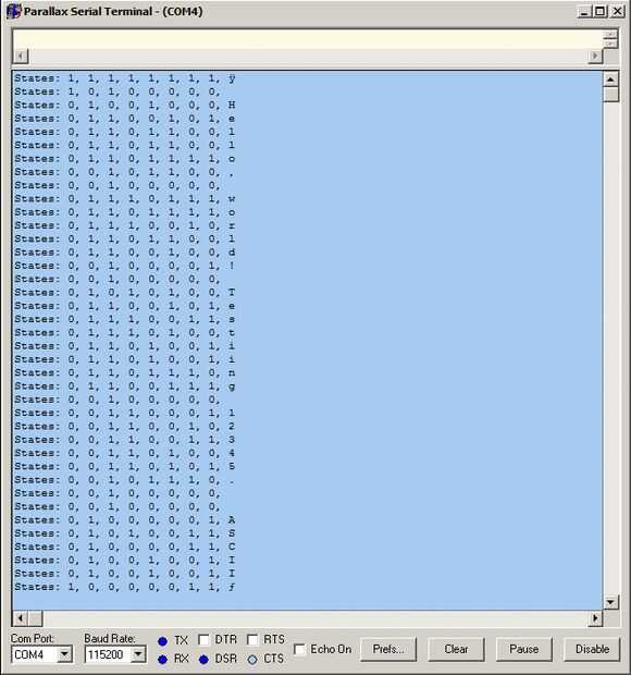 Ahora que tienes todo atado con alambre para arriba, tienes el lector preparado - encienda la placa del propulsor de la paralaje. El LED debe encenderse para arriba. Recuerde que el led que está más lejos de los demás debe ser emparejado con el pulso de índice. Si usted esta viendo los mensajes de impares, asegúrese de que el encabezado de los fotorresistores está conectado, en la dirección correcta.