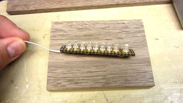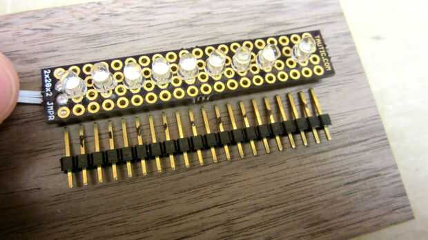Mirar a través de su madera. Encontré un trozo de nogal que fue aproximadamente dos veces la altura de los LEDs en el tablero y lo suficientemente amplia como para ~1.5cm espacio libre a ambos lados de la perfboard.