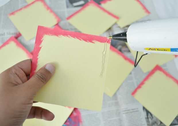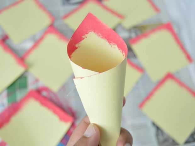 Aplicar una línea de pegamento a la parte superior derecha de la Plaza. Doblar el lado izquierdo de la plaza para el centro y envolver la derecha de la Plaza sobre él para hacer una forma de cono. Repetir lo mismo a todas las plazas. Hace alrededor de 50 conos para empezar a hacer la Dalia, usted siempre puede hacer más si quieres.