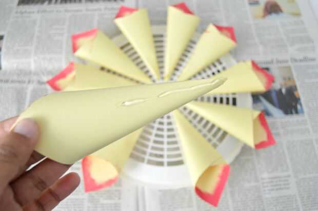 Aplicar una línea de pegamento en la parte posterior del cono y péguelo en la parte posterior de la placa dejando una pulgada de separación entre cada cono que pegar.