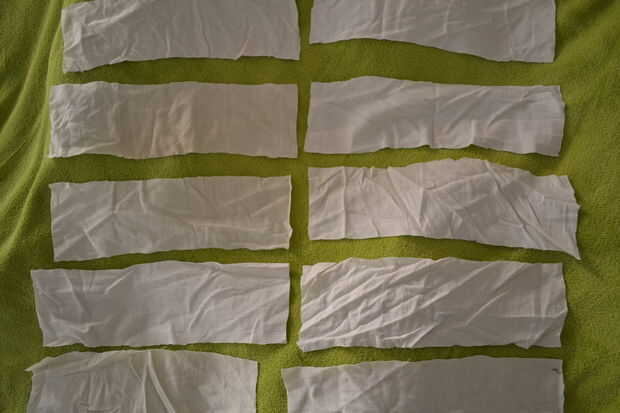 Corte la sábana en tiras largas (ancho como un pedazo de papel higiénico), dejar un rectángulo para hacer la bolsa (sobre los 30x40cm) y una raya larga y delgada para hacer la cinta (about3x45cm).