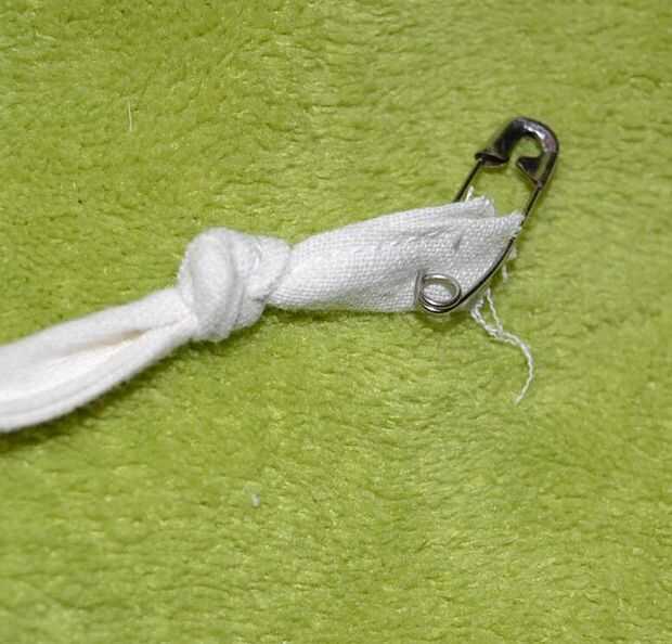 -Poner un alfiler en uno de los bordes de la cinta y hacerlo correr a lo largo del orificio de la bolsa.