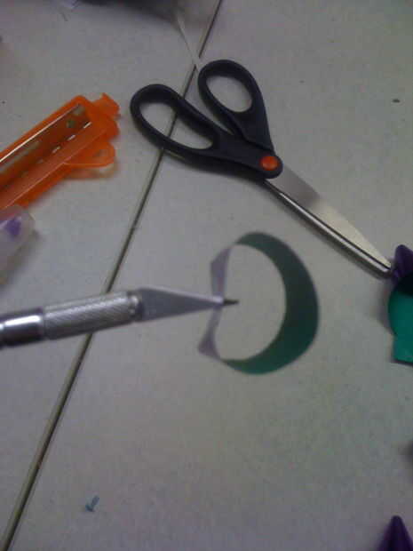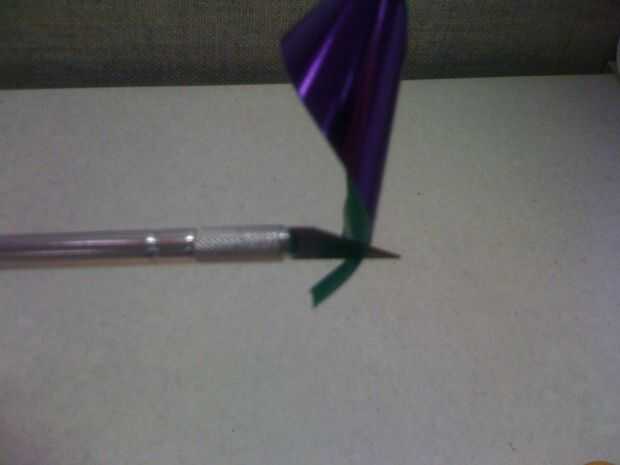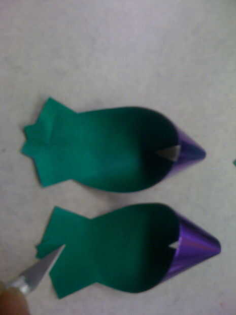Con el cuchillo del exacto, asoman pequeños agujeros cerca del extremo de las tiras cruzadas y un agujero en el centro de la parte plana del bucle.