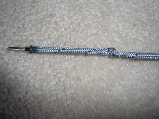Una vez haya terminado este lazo paso un nudo en el extremo de la pluma en el cable para asegurarse de que no mueva tanto y arruinar el látigo o la bodega.