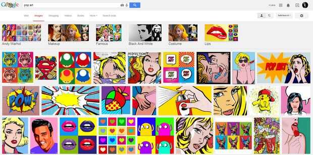 Sólo hice una búsqueda en google para "pop art" y hacer clic en "imágenes" para encontrar la imagen que me ha gustado mucho. La mía es artista Roy Lichtenstein. La primera imagen de este tipo encontré era pequeña, sólo 397px x 400px. He reducido mi búsqueda a "lichtenstein" y selecciona "herramientas de búsqueda" buscar imágenes "más grande que 2 MP." Al hacerlo, pude encontrar la misma imagen que era 2433px x 2406px, que es mucho más clara y fácil de seguimiento cuando se amplía a través del proyector.
