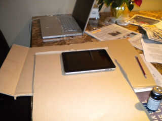 El marco debe ser ajustado con aproximadamente 1 pulgada en el iPad. También, cortar el cartón para que el borde de la caja está en el lado izquierdo y corte a la que se está pegando un cartón grueso (ver foto). Este borde ofrece un labio agradable para conectar la cubierta así que pone plano y pliegues detrás.