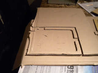 Corte el interior plantilla. Luego volver y cortar aproximadamente 1 pulgada fuera de la plantilla. Donde los accesos fueron marcados, cortan éstos hacia fuera dando por resultado tres piezas separadas (no cortar el jack del auricular hasta más tarde para mantener las piezas simple).