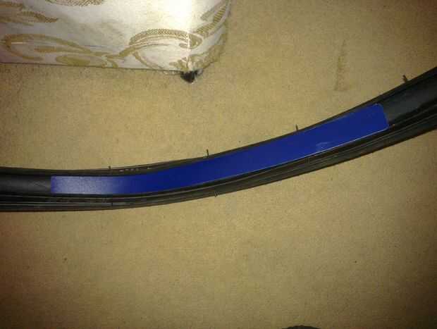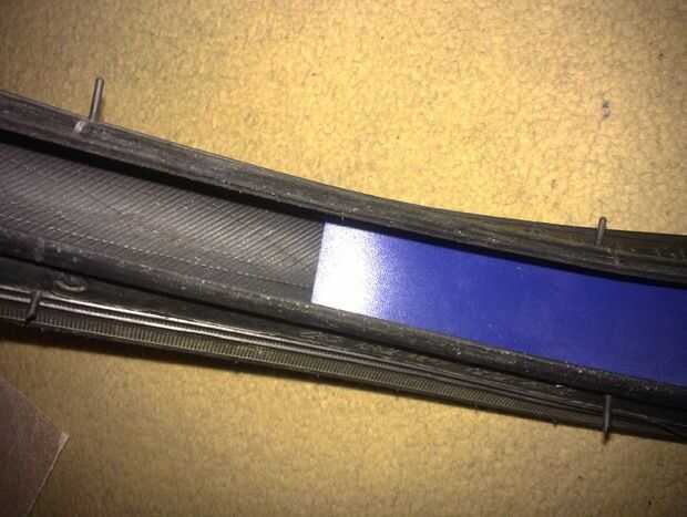 Previamente probé para ver cómo encajaría, coloqué una tira en el neumático, la tira debe quedar dentro del neumático, no demasiado apretado, pero no demasiado floja. Recuerde que dije que era muy importante medir con precisión, si la tira es demasiado ancha no dobla con eficacia dentro del neumático.
