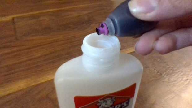 Añadir el colorante a su cola. La cantidad de colorante que se agrega depende de lo claro u oscuro desea que su pintura sea. Mezclar colores y ser creativo si quieres.