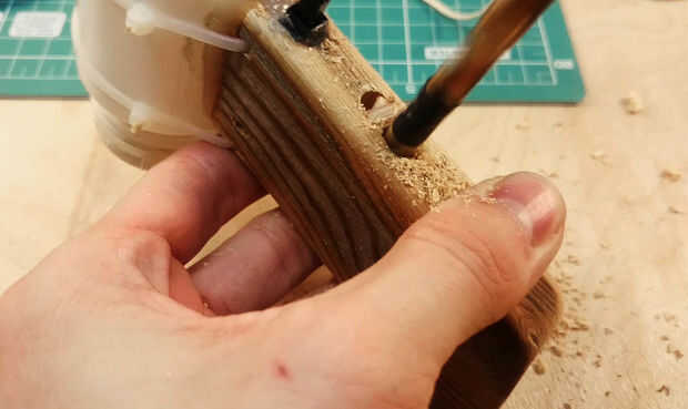 Utilizar este botón antiguo (no tienen otro), pero es mejor botón táctil SMD. Perfore un orificio de un botón, un cable de la fuente y lo de la soldadura. Poner un botón en sus lugar y llenar las lagunas con pegamento caliente.