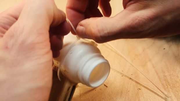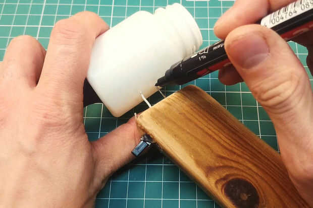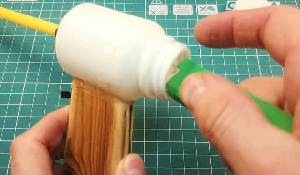 Marcar y hacer agujeros para los electrodos en la cámara de combustión, luego moler para que se pegue mejor y palo al mango con el pegamento caliente. También puedes resistencia de montaje de la cámara con unas bridas.