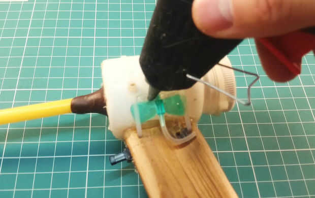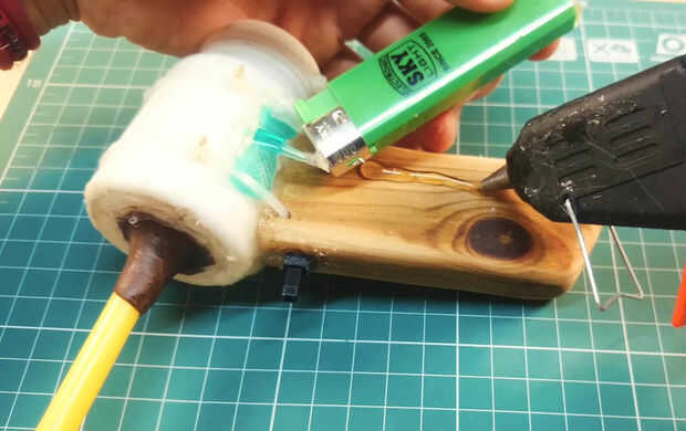 Preparar un mango para pegar un encendedor por molerlo. Ligeramente curva de la aguja de un catéter jab en la cámara de combustión y fijar con pegamento. Poner el extremo libre del tubo en la boquilla del encendedor y me pegue el encendedor de la manija con pegamento caliente.