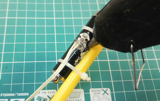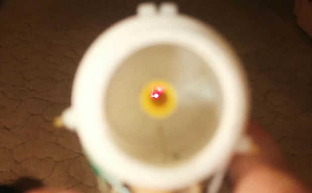 Coloque un puntero láser al cañón con bridas y afinar así, puedo ver un punto rojo a través del cañón. Y ahora puntero láser al cañón con pegamento caliente.