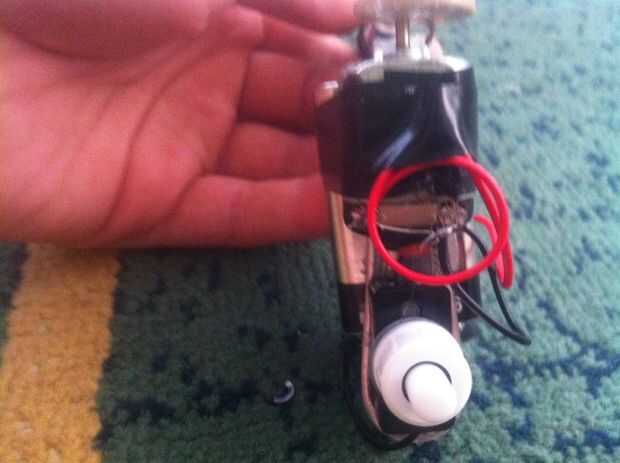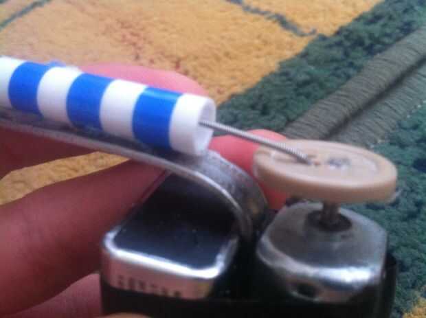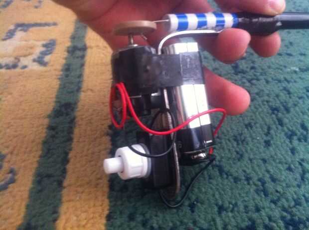 1-saca todas las cosas dentro del lápiz mecánico. 2 - cortar el extremo de la cuchara y doblar en un ángulo de 90 grados. 3 - pegar el lápiz mecánico en la cuchara. 4-conectar el motor, la batería y el interruptor rápido conector juntos. 5 - pegue en la cuchara y conecte la batería de 9v a su conector rápido. 6-corte un pequeño pedazo de la cuerda de la guitarra (depende el tamaño de la máquina) y curva como lo hice en las imágenes. 7-cola de la aguja en el extremo de la cuerda de la guitarra. 8-Introduzca a través de la aguja la punta de la pluma y luego insertar la parte doblada de la cuerda de la guitarra en uno de los agujeros del botón