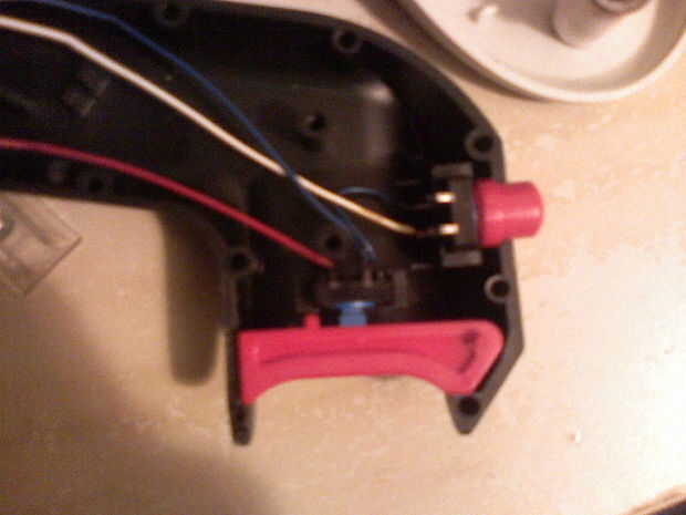 Abra el asa del joystick e identificar los cables para cada botón. en este caso, el cable disparador es de color rojo, el botón de arriba es blanco, común es de color azul. (común es un cable que conecta a ambos, por lo que sólo necesita 3 cables en lugar de 4)