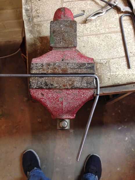 Utilizando el extremo de la varilla con el 4 y 5 pulgadas marca, coloque la varilla firmemente en el vicio. Asegúrese de que el interior marca (la más cercana a la mitad de la barra) es en el borde de la mordaza, como se muestra en la foto. Una vez que la barra es segura, doble la varilla en un ángulo de 90° como se muestra.