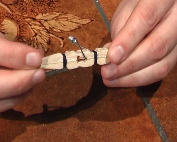 Unir dos partes de una clavija con un hilo (o cualquier cuerda o cinta) e inserte el resorte como se muestra en la foto.