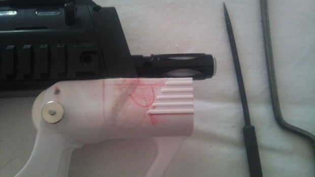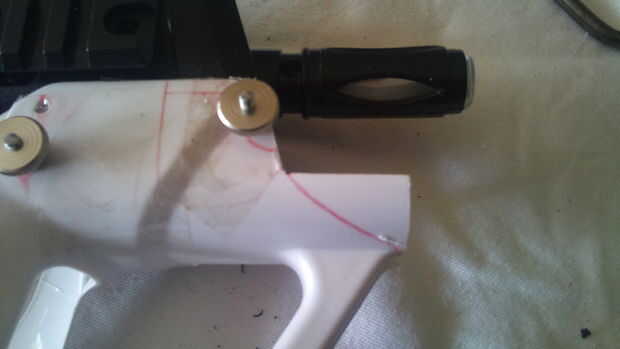 Para aquellos de ustedes que deseen utilizar el MP7A1 en vez de la G36C, tienes que hacer los agujeros de perforación aquí y ahora si quieres. Utilice la pizarra para hacer las marcas para perforar. Esto asegura no salga con zapatillas y caída con el perforador. Tenga en cuenta que el taladro en las velocidades de disparo puede arruinar a tu perforador debido a la fusión del plástico, así que tómatelo con calma y tratar de una velocidad media estable. Tapónes de la puerta simple de uso para llenar el espacio y garantizar un ajuste. Cortar para caber con algo afilado como un cuchillo de cirujanos más o menos.
