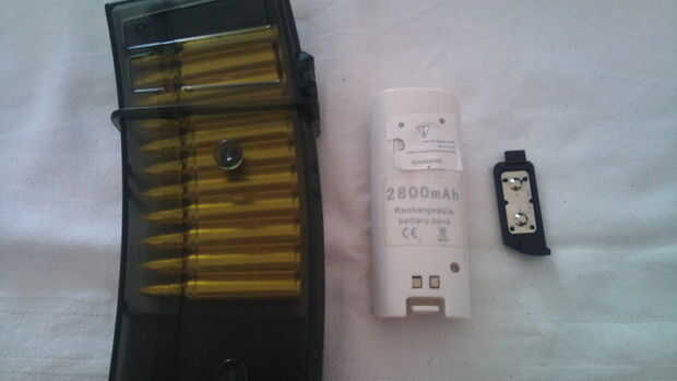 Como se aprecia en la fotografía se trata de una pistola de juguete con vibrador, sonido y luces. Desde el control remoto Wii solo necesita dos pilas AA y la MP7A1 tiene lugar para tres, su uno demasiado. Compruebe la foto!