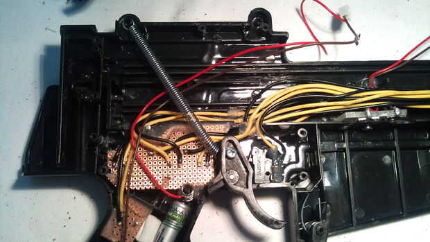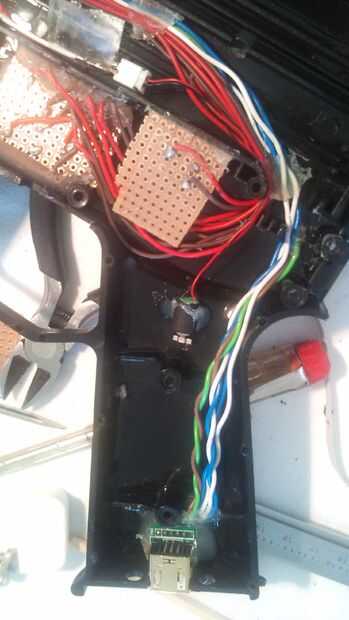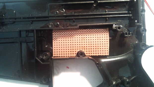 Tomar medidas exactas del conector del Nunchuk con la regla calibrador y haz el dibujo debajo de la empuñadura con la punta de trazar. Hacer las mediciones un poco más pequeño, luego cortar poco a poco. Recuerde también Compruebe y vuelva a verificar. Aquí yo casi cortar otro dedo también. Sólo sella el corte y se encendió. Cuando todo encaja, asegurar con pegamento caliente, no ser demasiado tacaños pero no se hasta generosa con el pegamento.