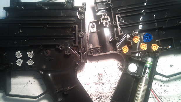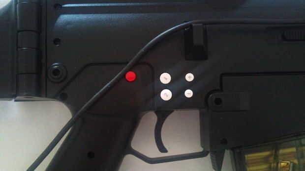 Como se puede ver en la fotografía sólo perforó un agujero, colocado un tornillo con una rosca M5 más una tuerca adecuada. La tuerca que fija con pegamento. Elegir la longitud correcta para el tornillo y la posición el botón B y listo para disparar. Fije el botón de B con el adhesivo caliente!