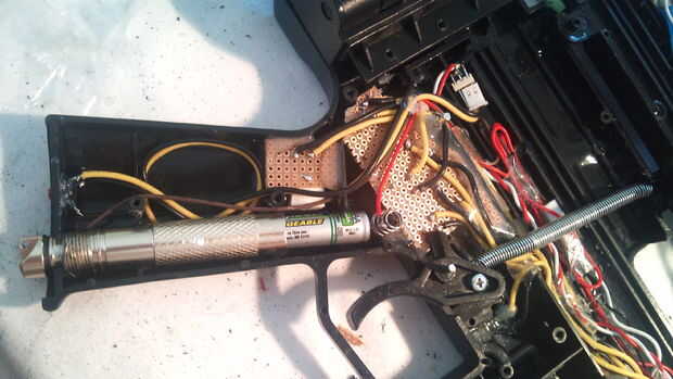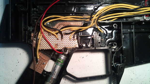 Tienes que actualizar algo esencial. Coloqué la caja de la antorcha donde está ahora, ya que hay moldes de plástico que parecen como si este diseño podía llevar una versión de batería con luces y así sucesivamente. Lo que hice fue calentar la carcasa con un hierro de soldadura 50W. Después se transporta suficiente calor podría oler un ligero olor del plástico. Es un buen indicador para presionar contra la carcasa de la antorcha. No tiene prisa o de lo contrario algo podría suceder. Ver una imagen en el paso 6:mantenga la plancha en la caja para que no enfríe y presione con un destornillador grueso más o menos. Continuar con este procedimiento hasta que se alcanza la profundidad deseada! Entonces asegurar la caja con pegamento estupendo.