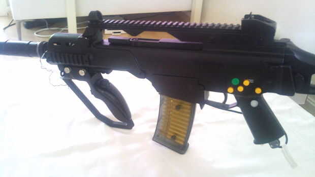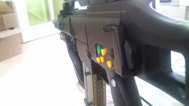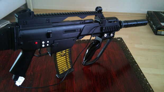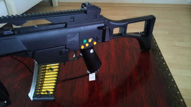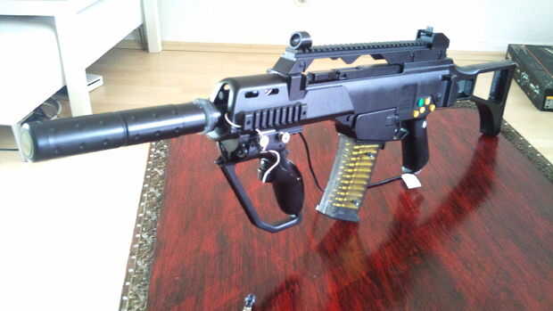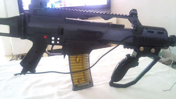 Esto no es un arma muy ligero pero no es demasiado pesado ya sea. Juego es impresionante pero straineous if será incorrecta. Mano que siempre sostiene el Nunchuk, el brazo debe ser presionado contra el cuerpo. Así que algo como el verdadero cosita aquí. Si no la muñeca comienza doler tarde o temprano. Yo supongo que es por qué el Zapper de Nintendo tiene el Nunchuk en la parte posterior. Rótula para el Nunchuk Foregrip resolverá este asunto menor. En primer lugar tenía en la mente de todos modos y sólo podría cambiar la construcción. R/C juguetes a menudo salen con rótulas, principalmente los coches o helis. Aparte de ello funciona espléndidamente y l encanta. Así que tan pronto como usted está listo para hacerlo igual Metallica con el Kill Em todos. La correa de su pistola de VK G36C, tiro en Epic Mickey y hacer algunos adelgazamiento y pintura. Usted también podría lanzar en Goldeneye o cualquier otro juego de la muerte virtual.