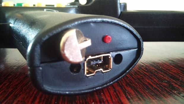 Bien ahora es el momento para completar el trabajo. En mi caso utilicé la pieza infrarroja Scorpion VII, resulta ser todo así. Tuve que hacer un poco más grande el agujero del silenciador. Por lo tanto centrada la pieza infrarroja y dibujar un círculo con una punta de trazar, una punta de trazar no es una necesidad y todo lo que es puntiagudo como una aguja o un tornillo funcionará así. Perforé lejos tanto como podía con el taladro y luego presentar poco a poco. No pegado pero es una solución de presión hice. Presentar en una dirección de ángulo, como un embudo. Hacer este trabajo antes de poner en la Wii Board. Bueno todo eso queda demasiado ser hecho es deslice en la Wii Board, enroscar el tapón de rosca, Únete al silenciador la construcción completa de viviendas con la tapa y el pegamento caliente. No olvides tomar la cinta de la cámara.
