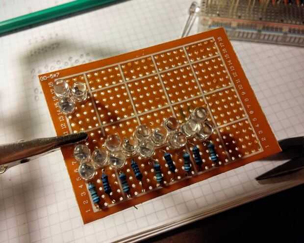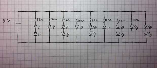 • Cinco de estos pares rojo están conectado en paralelo con cuatro de los LEDs azules.