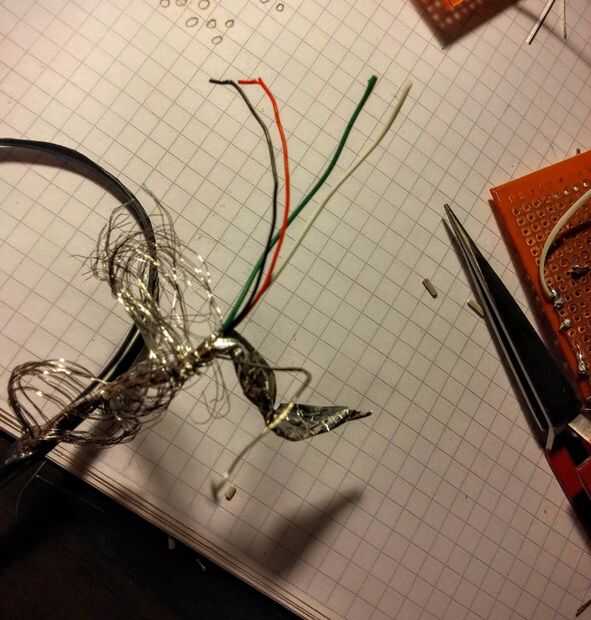 Rasgar abierto el cable USB y recorte el blindaje y las líneas de datos. Las líneas de datos son el blanco y verde. Para evitar un corto circuito, corte los cables en diferentes longitudes.