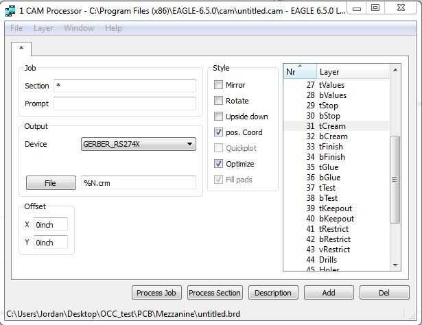 Una vez tengas tu diseño terminado en águila, tendrá que exportar un archivo de Gerber que contiene sólo los datos de las teclas de componente SMD. Para hacer esto se vaya a la ventana de panel de control de águila y ve a archivo -> Nuevo -> trabajo de Cam. En la nueva ventana ir a archivo -> Abrir -> tablero y desplácese hasta la ubicación de directorio en el explorador de abrirlo. Una vez que la tabla está abierta en el trabajo de cam que tenemos que asegurarnos de que nos dará el formato adecuado de Gerber.