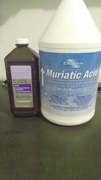 La solución para el proceso de producción requiere una mezcla de una parte de ácido muriático y tres partes agua oxigenada. Te recomiendo usar guantes al hacerlo y ropa vieja para reducir el riesgo de arruinar un buen par o pantalones o una camisa bonita.