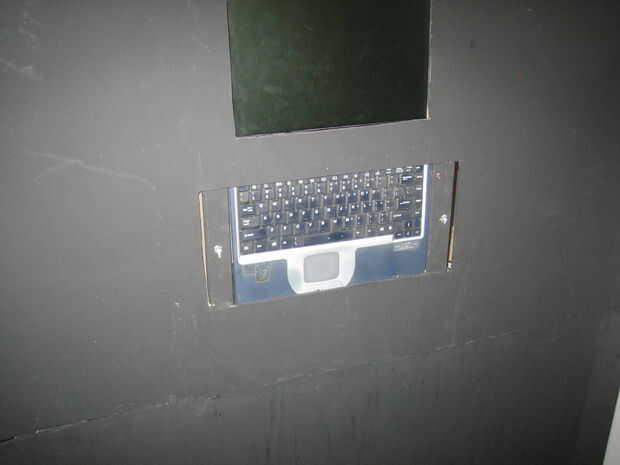Este paso será altamente dependiente de la computadora particular que usa. Empezar por desmontar la pantalla de la base del teclado (a menos que su pantalla de ordenador portátil se repliega en 180 grados - que hace las cosas mucho más fácil) y donde van a quedar todos los componentes en relación a uno con el otro. Luego planificar el tamaño de la abertura de la pantalla y el panel de acceso de teclado (a menos que va a depender de un teclado externo y mouse para la instalación y mantenimiento). No olvide considerar el botón de encendido. Botón de encendido de mi PC es sobre el teclado, así que creé un interruptor "stealth" perforando un agujero pequeño sobre el interruptor; Enciendo el PC por meter mi llave Allen más pequeña a través de.