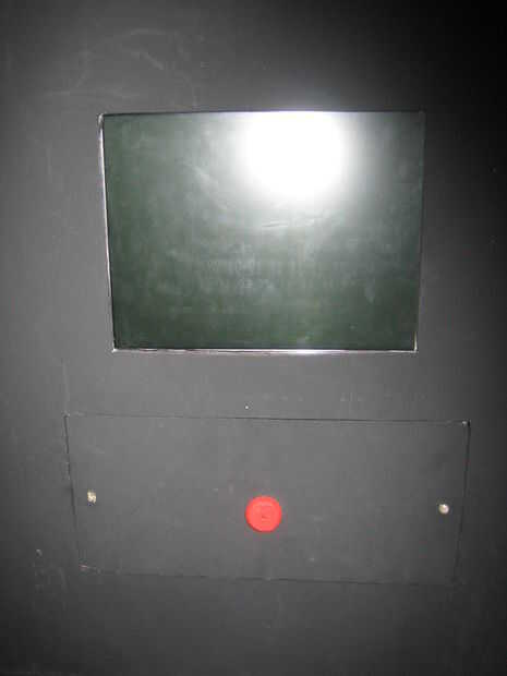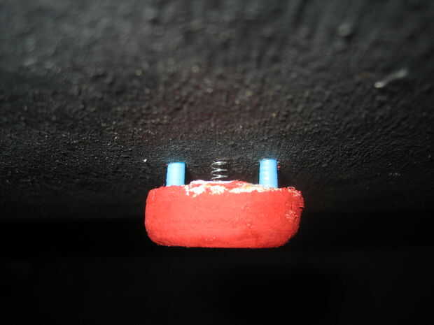 Usted también tendrá un botón para tus invitados empujar. Puede obtener un botón USB alimentado de varias fuentes en línea (algunos de lo software comerciales photobooth incluye uno), pero debido a la falta de USB disponible puertos, decidimos ir Low-Tech y un botón que empujar a través y pulsar la barra espaciadora. Se hace desde el enchufe de uno de los orificios que hemos recortado, Dremeled hacia abajo para darle un borde redondeado y kludged junto con un resorte de un bolígrafo clicky y un par de 'barras de guía' (tornillos con una pajita de plástico cortadas envuelto alrededor de ellos para hacer que se deslicen bien).