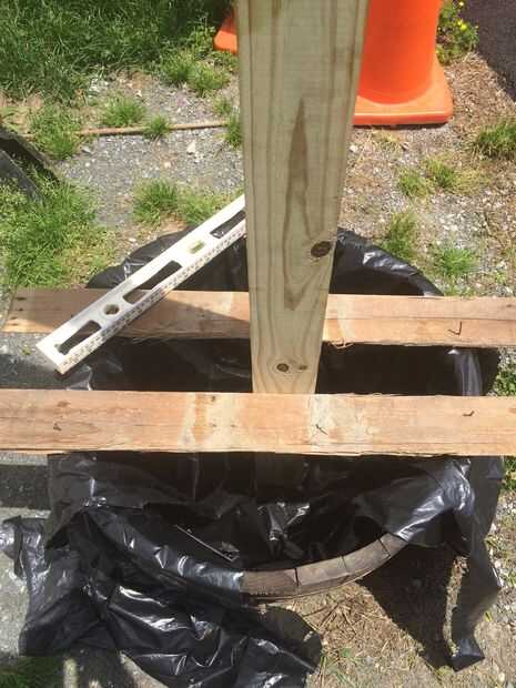 Si se centra donde usted lo desee, fije temporalmente con 4 tableros, uno a cada lado. Virar dos (uno uno cada lado del poste) para el cañón (pequeños clavos para que no arruinara el barril). Virar los otros dos a los dos primeros tableros. Ahora tu post debe estar parado vertical sin tener que mantenerse en su lugar.