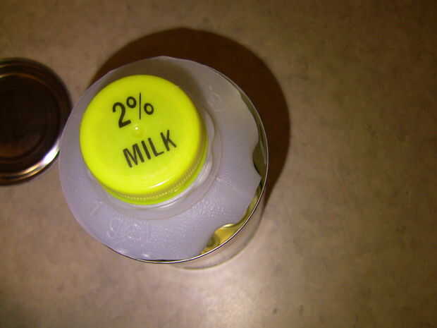 Abra la parte inferior de la lata con un abrelatas y deshacerse de su contenido. Limpiar y secar. A continuación, cortar la parte superior de la caja de cartón de leche para que la circunferencia es