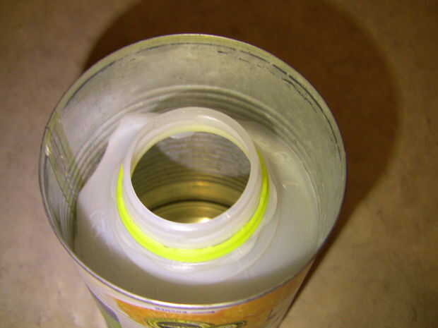 Tomar la pieza de la caja de leche y presionar en la lata (cara), lo suficiente como para que la parte superior está nivelada con la parte superior de la lata. El borde de la pieza de cartón de leche deberá "hacer clic en" a las ranuras en el interior de la can. ASEGÚRESE DE QUE LA ABERTURA ESTÁ EN EL CENTRO. Es importante que se encuentra en el centro, porque si no es así, no se a enroscar correctamente. Lije la parte superior de la tapa de la caja de cartón leche para que tenga una superficie rugosa para pegar. También la arena la parte inferior de la lata (la parte que usa el abrelatas para quitárselo). Una vez hecho esto, poner pegamento en el lado áspero (superior) de la tapa de cartón de leche. Colocarlo boca abajo en el