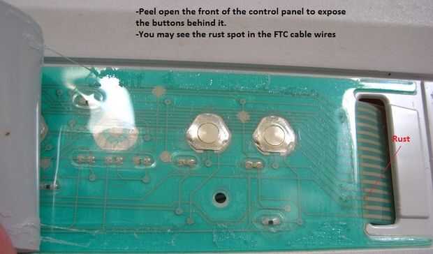 El panel de control es simplemente un pedazo de plástico con todas las teclas y un cable. ¿Qué puede estar mal? Cuidadosamente había examinado el panel de control y no encontrar ningún problema inicialmente. Luego en la parte posterior del cable, encontré un pequeño punto en algunos de los 14 alambres en el Cable plano de plástico (FPC). Parecía el cable pero era realmente óxido! Después de quitar el moho, revela que el cable estaba roto en ese lugar por varios alambres, que explica por qué no funciona el botón "Start".