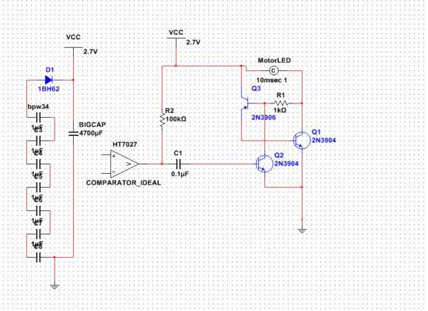 así que usamos un circuito llamado "motor solar", a la energía eléctrica del almacenaje, y un trigger(HT7027A) de voltaje para detectar el voltaje capacitivo, cuando a 2.7V, el gatillo hacia fuera pondrá un "alto nivel", por lo que activar todo el circuito, comenzar la descarga, el Motor y comienzo trabajo. Repita este proceso